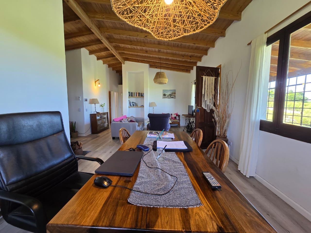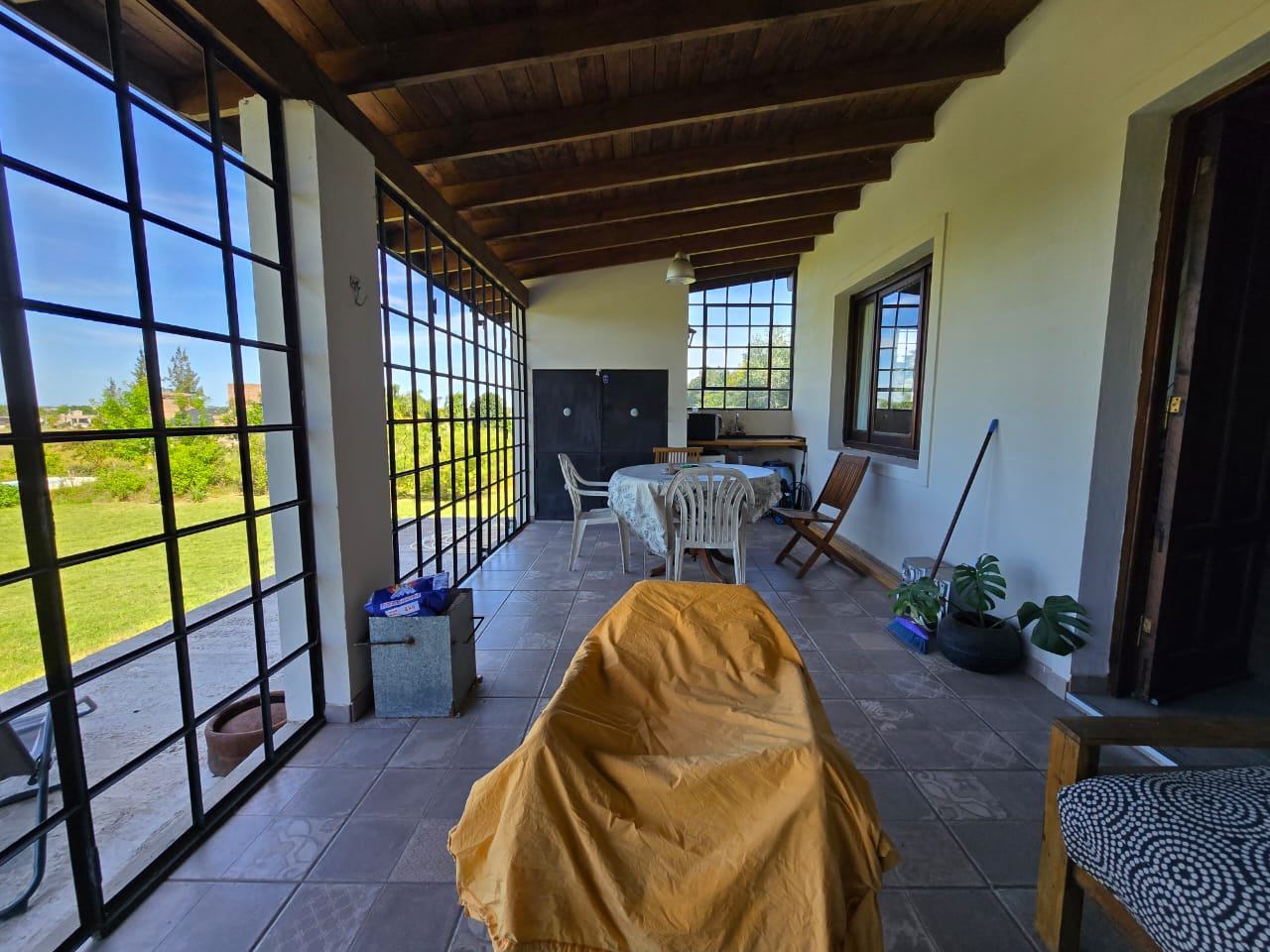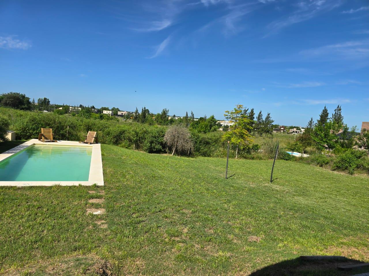 El exterior de la casa es igualmente impresionante, con una galería que incluye una parrilla, ideal para disfrutar de asados al aire libre con familiares y amigos. Además, cuenta con un gran parque y una refrescante piscina que invitan a relajarse y disfrutar del sol. Esta propiedad está disponible solo durante el mes de enero, lo que la convierte en una excelente opción para quienes buscan una escapada temporal en un entorno natural y apacible.