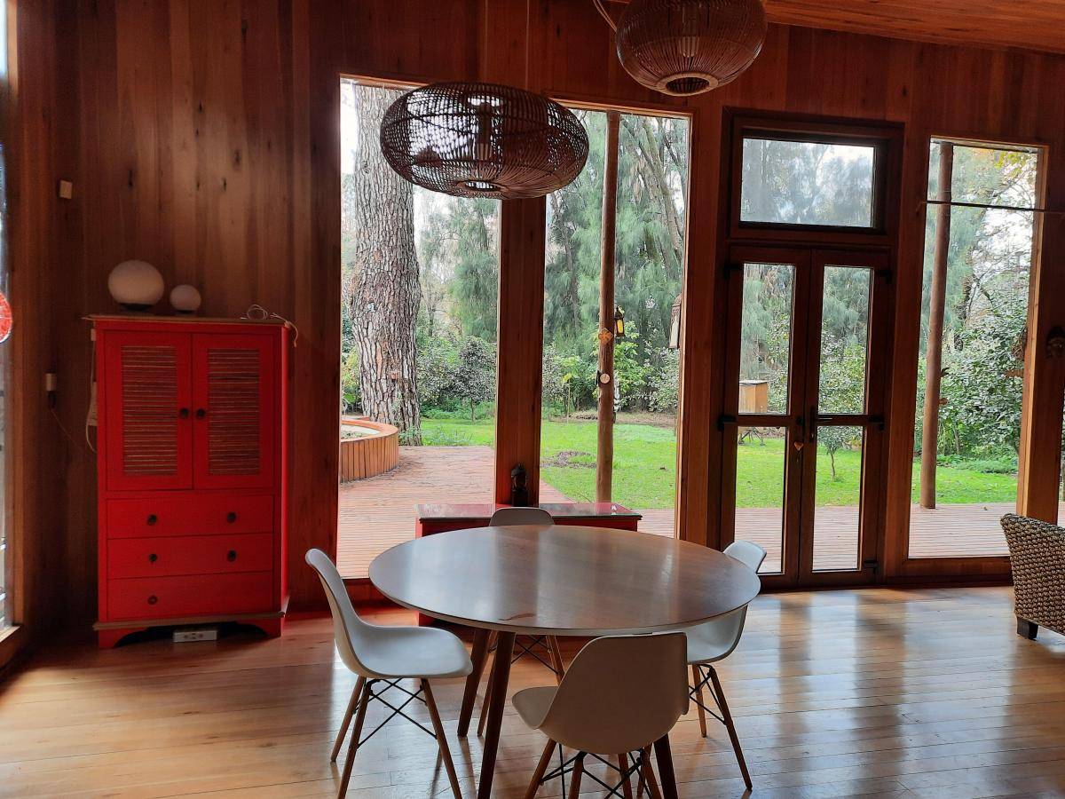 Rodeada de un bosque soleado, la propiedad ofrece un parque exuberante con una variedad de frutales, incluyendo paltos, limoneros, naranjos, ciruelos, bananeros y frambuesas, todo con riego automático. La piscina redonda de fibrocemento está acompañada por un amplio solárium y una galería ideal para disfrutar de momentos al aire libre. La instalación de agua cuenta con una bomba presurizadora que garantiza una gran presión en toda la casa. La propiedad se asienta en un lote de 900 m², con una superficie total de 200 m², de los cuales 100 m² son cubiertos y 89 m2 semicubiertos. Además, dispone de cochera cubierta para un auto y otra descubierta, con posibilidad de ampliación muy fácil.